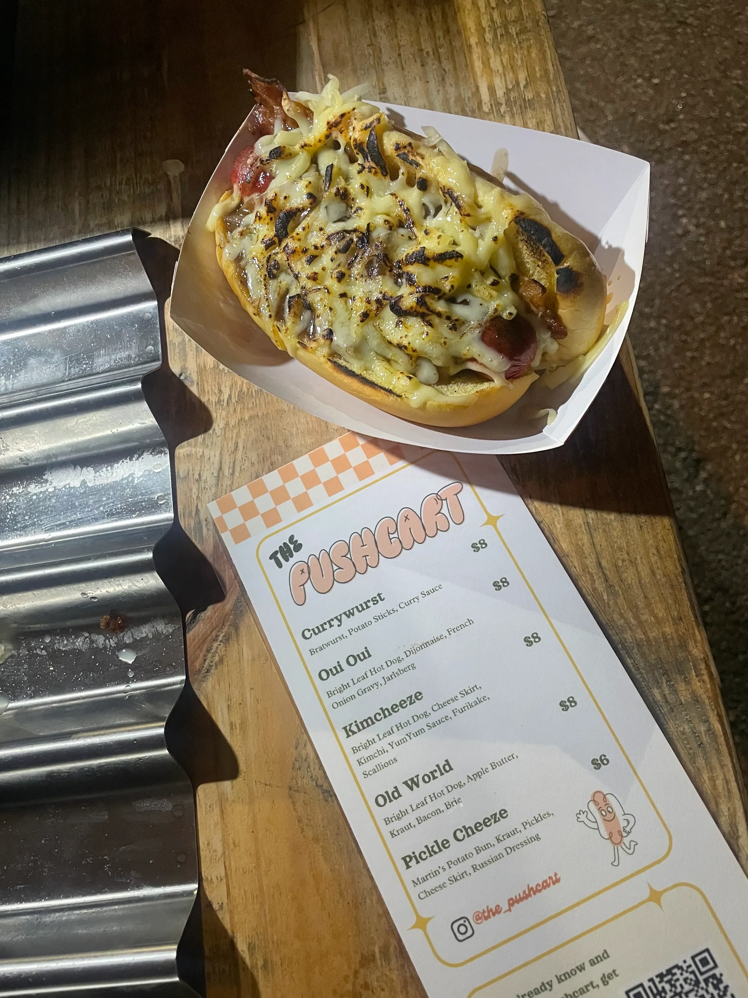 Hot Dogs are an All-American comfort food. We fully embrace this as we take some regional classics and thoughtfully re-invent them. Our mantra is, “Keep it fresh, keep it fun”! We use Bright Leaf hot dogs and Martin’s potato buns to hold’em. The Pushcart is currently operating as an “event only” operation. Book us for your next party or host us for a pop up!